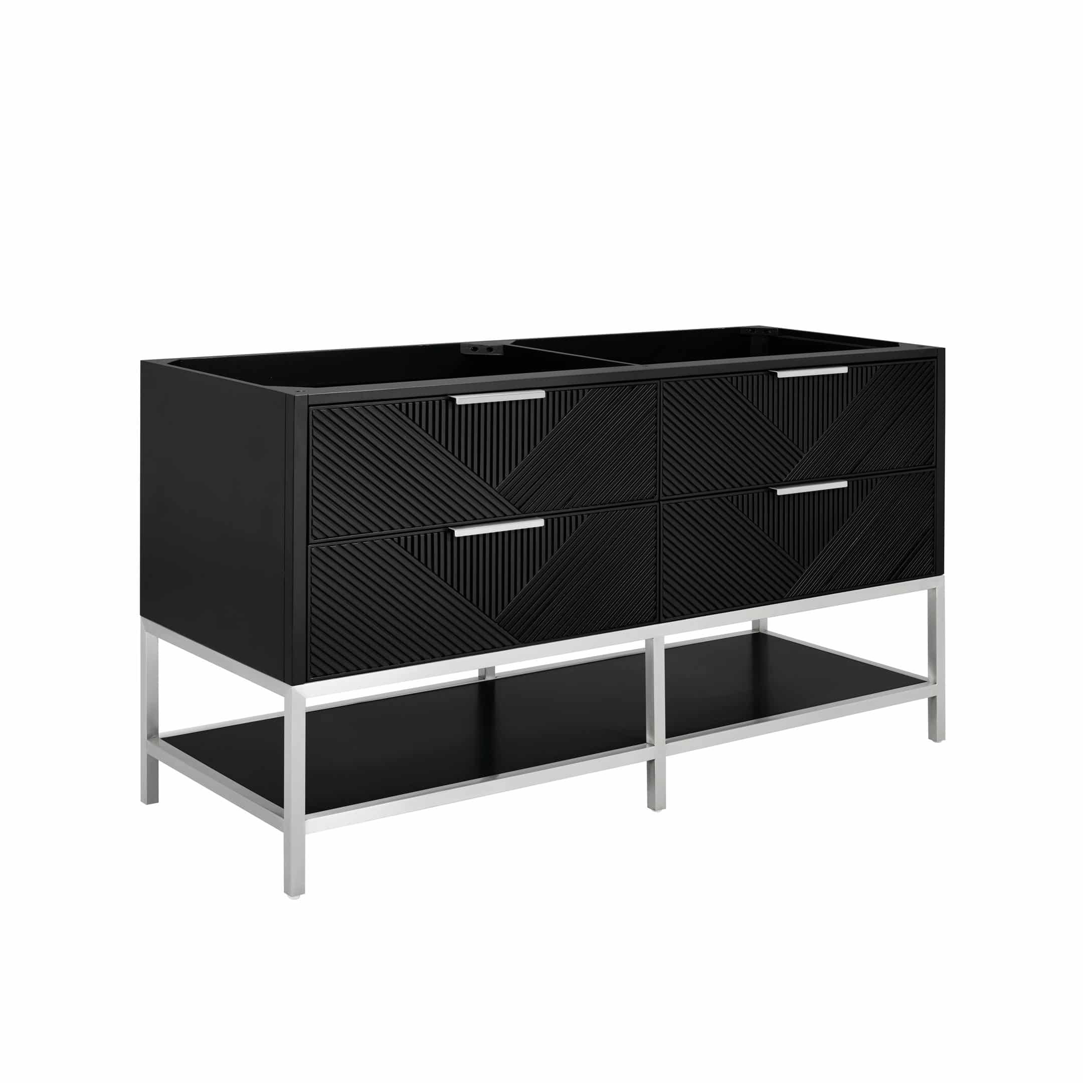This showstopper is a design lover’s dream. Dynamic diagonals atop the drawer faces set off this faceted design. Handles on each drawer add a subtle touch of refined elegance and style. An open shelf at the base elevates the vanity, creating a feeling of openness and providing a spot to store towels or essentials. Available in Walnut or Charcoal Black with Satin Brass, Matte Black, or Brushed Nickel trim, the Diamond is the statement piece bound to grab your attention.